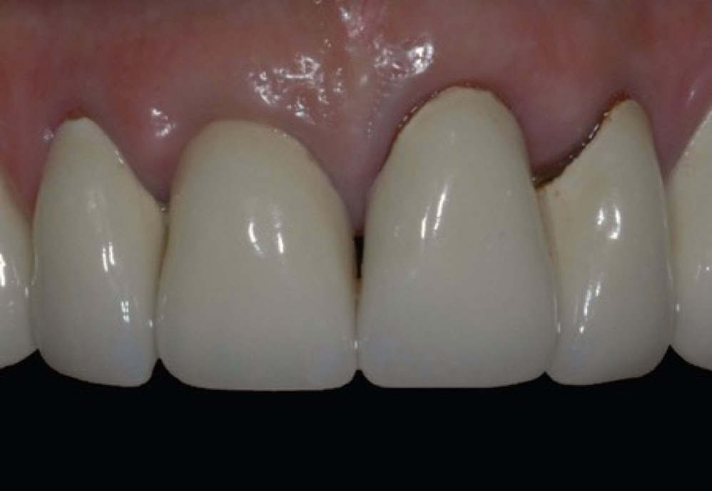 Häufig zieht sich das Zahnfleisch bei verblendeten Keramikkronen bis an den metallenen Kronenrand zurück. Dann wird dieser Metallrand als dunkler Saum am Zahnfleischrand sichtbar.